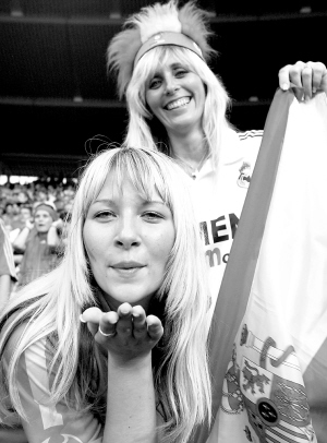 ←6月22日,西班牙队战胜意大利队后,两位西班牙女球迷笑逐颜开。 新华社发