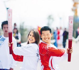 | →23日,火炬手、美国人保罗(右)与下一棒火炬手、美国人克纳交接后合影。 新华社发 |