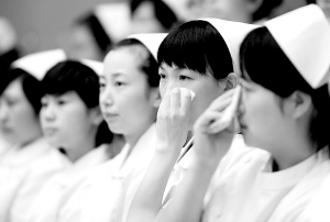 6月23日,几位听报告的护士流下了热泪。当日,由中宣部、中组部、解放军总政治部和四川省委联合组织的抗震救灾英模事迹报告团在浙江举行报告会。 新华社记者 王定昶摄