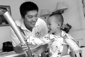 6月23日,在西安唐都医院爱心病房,奥运火炬手王振带着“祥云”火炬看望“敬礼娃娃”郎铮。当日,奥运火炬手、空军某部飞行员王振带着“祥云”火炬来到西安第四军医大学唐都医院,看望“敬礼娃娃”郎铮。奥运火炬手王振在火炬传递结束后特地来看望小郎铮,与他分享奥运带来的喜悦。 新华社发(邢文 摄)
