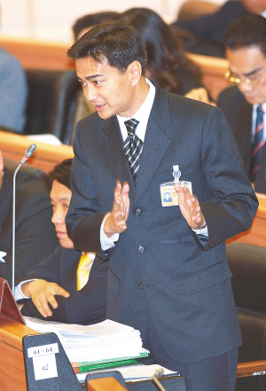 6月24日,泰国民主党领导人阿披实·维乍集瓦在国会下议院特别会议上发言。 新华社/法新