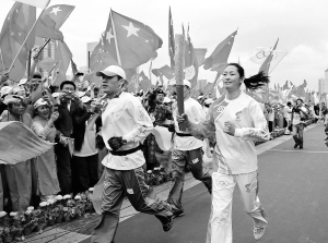 | 6月24日,最后一棒火炬手李春秀在进行传递。当日,北京奥运会圣火在西宁传递。