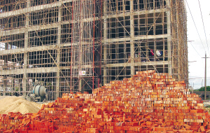 | →在三亚的很多建筑工地,红砖使用仍大行其道。 本报记者 张谯星 摄 |