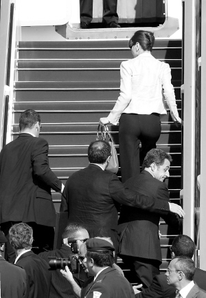 | 六月二十四日,在以色列特拉维夫的本-古里安机场,法国总统尼古拉·萨科齐(二排,右)和夫人卡拉·布鲁尼(上)在保镖的护卫下冲上总统专机。