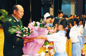 | 6月25日上午,由中宣部、中组部、解放军总政治部和四川省委联合组织的抗震救灾英模事迹报告会在省人大会堂隆重举行。图为少先队员向报告团成员献花。 本报记者 李英挺 摄 |