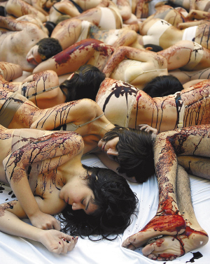 6月25日,数十名动物保护主义者在阿根廷首都布宜诺斯艾利斯市中心模仿动物遭到杀害、皮毛被剥去的场景,抗议服装业使用动物皮毛。 新华社/法新