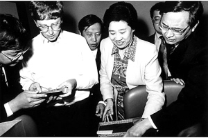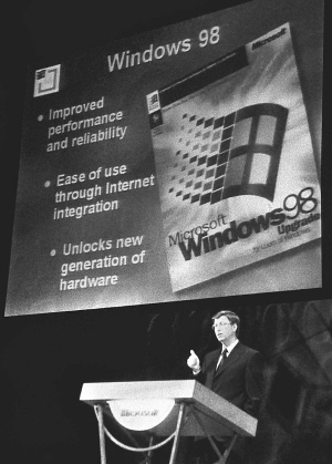 | 1998年4月20日,在美国芝加哥举行的春季电脑展上,盖茨为观众演示即将上市的“视窗98”系统。 |