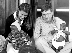 | 2003年9月21日,在莫桑比克一家医院里,进行慈善活动的盖茨和妻子美琳达各抱着一个婴儿。 |