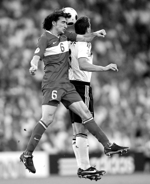 | 德国队球员(右)与土耳其队球员在比赛中争顶。