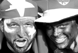 6月25日,德国队在欧锦赛半决赛中战胜土耳其队。图为看台上热情的土耳其球迷(左)和德国球迷合影。 新华社发