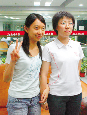 文科第一名曾昭仪(左)和理科第一名黄亚铷在一起。 本报记者 苏建强 摄