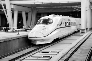 | 图为六月二十六日,一列CRH3“和谐号”动车组停靠在改扩建的新北京南站站台。 |