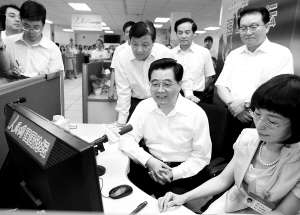 6月20日, 中共中央总书记、国家主席、中央军委主席胡锦涛特地来到人民日报社主办的人民网,看望网站工作人员。