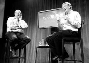 | 6月27日,在微软总部,盖茨(右)在员工送别自己的活动中讲话。旁边是微软首席执行官史蒂夫·鲍尔默。 新华社/路透 |