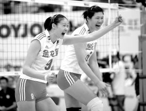 6月28日,在香港体育馆举行2008年世界女排大奖赛香港站的比赛中,中国队以3比0战胜日本队。图为中国女排队员赵蕊蕊(左)与队友一同庆祝得分。 新华社发