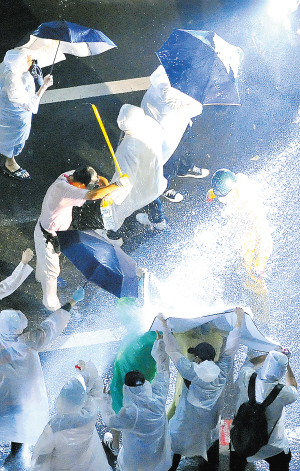 | 首尔防暴警察用水枪驱散抗议人群。新华社/法新 |