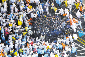 | 6月29日,在韩国首都首尔,抗议人群将防暴警察围在中央。 新华社/法新 |