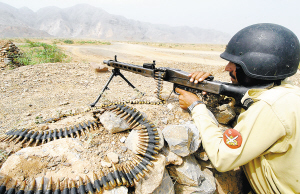 6月28日,一名巴基斯坦准军事部队士兵在巴西北边境省的开伯尔部族地区执勤。 巴基斯坦军方29日宣布从武装人员手中夺回西北部开伯尔地区控制权,炸毁了武装组织“伊斯兰军”领导人曼加勒·巴格的指挥所,迫使他逃往巴基斯坦与阿富汗接壤的蒂拉赫河谷地区,以确保驻阿国际部队物资运输通道安全。 新华社/法新