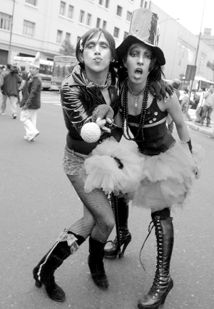 6月28日,在秘鲁首都利马,两名参与“同性恋的骄傲”游行的男子在街头表演。当天,名为“同性恋的骄傲”的游行在全球多个国家举行。 新华社/路透