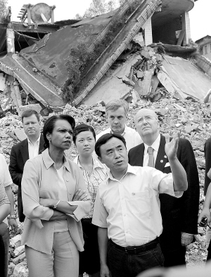 6月29日,美国国务卿赖斯(前左)在都江堰市一个体育俱乐部的废墟上听取介绍灾情。 当日,正在中国访问的美国国务卿赖斯前往地震灾区四川都江堰市,参观废墟,慰问安置点的受灾群众。 她是迄今为止访问中国地震灾区的美国最高官员。 新华社记者 陈铎 摄