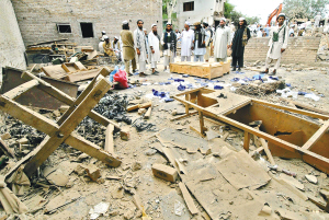 6月30日,在巴基斯坦西北部开伯尔部落地区,一些当地人聚集在被炸现场。当日,开伯尔部落地区的一个“宗教组织”的办公室遭到导弹袭击,造成7人死亡、2人受伤。 新华社/法新
