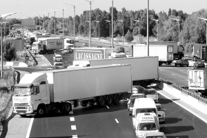 6月30日,在法国西南部的波尔多,一条环城公路被卡车堵塞。当天,法国大批卡车司机在法国多个城市以堵塞道路的方式抗议油价上涨,并要求政府支持运输行业。 新华社/路透