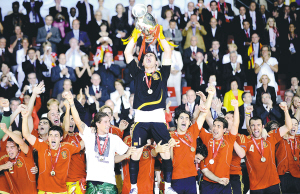 | 6月30日,在奥地利维也纳举行的2008年欧洲足球锦标赛决赛中,西班牙队以1:0战胜德国队,获得冠军。图为西班牙队球员高举冠军奖杯。 新华社发 |