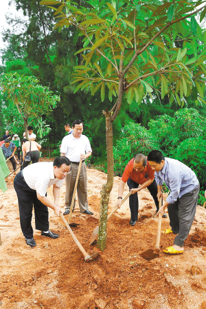 6月30日上午,海口市绿委办、龙华区园林局、城西镇以及苍西村100多名共产党员,在苍西村挥锹挖坑开展义务植树活动,以建设文明生态村的行动来庆祝党的生日。 本报记者 古月 摄