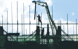 7月2日,海口市青年路民安小区廉租房建设工地,施工人员冒着酷暑浇筑混凝土。据悉,这是海口市第一个利用政府储备地开发的廉租住房项目,预计小区一期工程可在10月份交付使用。届时,将解决1000多户困难居民的住房问题。