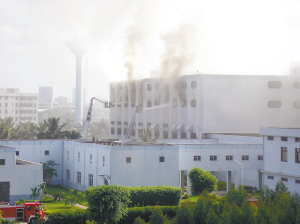 本报热线66810222消息 (记者林伟)7月5日凌晨4时半左右,位于海口市府城镇振兴路的海南红塔卷烟厂发生严重火灾,接警后海口及周边市县消防部门投入47辆消防车300多名官兵展开联合紧急扑救。当天下午5点,火势得到控制,灭火工作仍在进行。