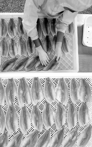 | 位于海口市美兰区的台资企业蔚蓝海洋公司生产的优质罗非鱼片正待出口。