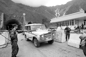 | 七月三日,在格鲁吉亚自治州南奥塞梯与俄罗斯的北奥塞梯共和国交界地带,南奥塞梯边防人员检查过往车辆。 新华社/法新 |