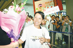 本报讯 北京时间7月5日下午1点23分,在温布尔登网球公开赛上取得历史性女单4强成绩的中国金花郑洁乘坐国航CA938号航班从伦敦顺利回到了北京。在首都国际机场的三号航站国际到达大厅,郑洁一走出海关就受到了热烈的欢迎,瘦小的她被前来接机的人们里三层外三层包了好几圈,掌声鲜花源源不断地送到了郑洁手中。