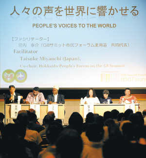 | 7月6日,名为“人民峰会———我们可以改变世界”的论坛在日本北海道首府札幌开幕。这个主要由非政府组织参与的论坛呼吁八国集团领导人在讨论环境保护、世界和平与消除贫困等重大问题时倾听普通民众的声音。 新华社发 |