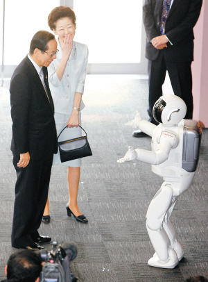 | 7月6日,在北海道洞爷湖畔的八国峰会媒体中心,日本首相福田康夫和夫人福田贵代子受到本田公司“阿西莫”机器人的欢迎。当日,福田携夫人视察媒体中心设施,并参观中心内展示的环保设备和节能设施。