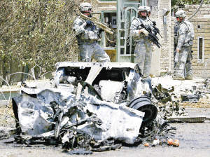 7月6日,美军士兵在伊拉克首都巴格达发生汽车炸弹袭击的现场警戒。伊拉克内政部官员6日说,巴格达当天发生一起针对警察巡逻队的汽车炸弹袭击,造成6人死亡、14人受伤。 新华社/法新
