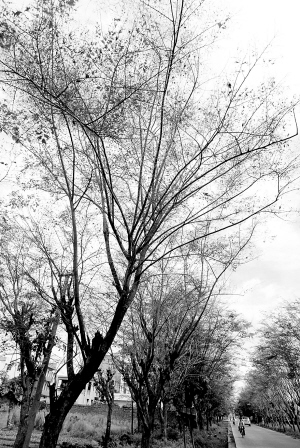 | ↑被啃食光的树木光秃秃地立在路边。本报记者 苏晓杰 摄 |