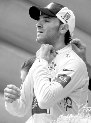 7月5日,2008年环法自行车赛在法国西部城市布雷斯特拉开战幕,亚·巴尔维德在第一赛段比赛中以4小时36分07的成绩获得第一名。图为西班牙选手亚·巴尔维德在赛后穿上黄色领骑衫。新华社发