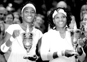 7月5日,美国选手威廉姆斯姐妹在温网公开赛女双决赛中,以2比0击败跨国组合美国选手雷蒙德/澳大利亚选手斯托索尔,获得冠军。 新华社发