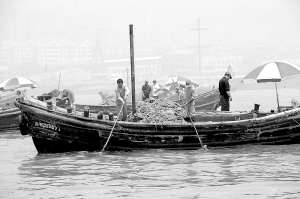 7月6日,渔船在银海帆船训练基地打捞浒苔。来自青岛、日照、烟台、威海等城市的1100多艘渔船参与了海上打捞浒苔行动。 新华社记者范长国摄