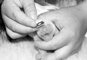 7月6日,中国保护大熊猫研究中心雅安碧峰峡基地的工作人员为刚出生的大熊猫宝宝做测量。当日上午,地震后由卧龙转移到雅安的大熊猫“帼帼”产下一对双胞胎,这是今年全球首只产仔的大熊猫。 “帼帼”今年12岁,是震后由卧龙中国保护大熊猫研究中心转移到该中心雅安碧峰峡基地的大熊猫之一。7月6日上午7时52分,在卧龙怀孕的“帼帼”产下了首只小仔;8时36分,“帼帼”产下了第二只小仔。 新华社发