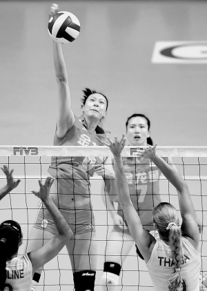 | 7月6日,2008年世界女排大奖赛澳门站的比赛落幕,中国队在与巴西队的较量中发挥欠佳,以0比3负于对手获得亚军。图为中国队球员赵蕊蕊(左)在比赛中扣球。 新华社发 |