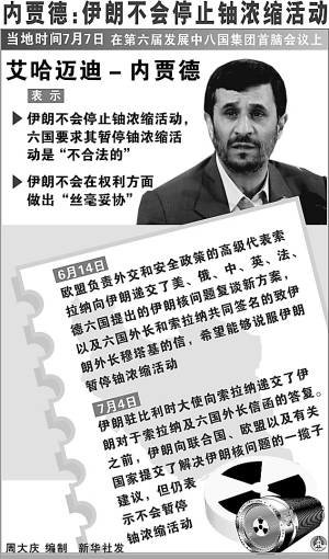 伊朗举行军演的同时,艾哈迈迪-内贾德7日发表谈话,称美国等西方国家要求伊朗放弃核计划的做法“不合法”。