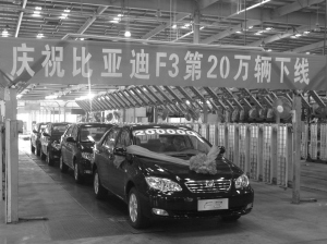 本报综合消息 在中级家轿或10万以下轿车领域,适中的价格和过硬的品质是产品成功的两大主要原因,比亚迪F3无疑依靠这两点在中级轿车领域刮起了越来越强劲的旋风。在伊兰特悦动、新凯越推出改款新车试图扩大市场占有率的同时,比亚迪F3第20万辆新车也于近日在西安顺利下线,中级家轿市场进入了一个新的竞争时代。