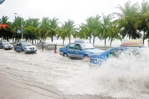 中午1时许,记者冒雨驱车于城区各地采访。在三亚湾路的迎宾路、友谊路交汇处,记者看到积水最深处已接近30厘米,过往车辆溅起的水花令路旁行人纷纷躲避。
