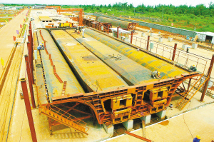 ←7月12日上午11时,在中铁17局集团第一工程有限公司美兰制梁场,重达700多吨的东环铁路最大箱粱模板制作成功。据美兰制梁场工程技术负责人介绍,今天制成的单箱双室梁预制模板,是东环铁路海口高架特大桥、南渡江双线特大桥、美兰隧道后段特大桥等工程的“咽喉构件”模板。该模板能否制作成功,是整个东环铁路建设能否按期或提前完工的关键。 本报记者 古月 通讯员 王梅玉 摄影报道