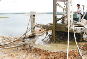 位于潭门镇的合水水库是一宗以灌溉为主、兼有防洪、供水、发电、养殖等综合效益的中型水库工程,运行41年来,由于年久失修,工程老化,安全隐患多,今年三月琼海市开始进行除险加固,总投资1145万元。目前除险加固工程正加紧施工,预计九月竣工。图为7月12日,工人正在合水水库大坝进行除险加固施工。 特约记者 蒙钟德 摄
