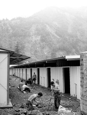 7月12日,几名建筑工人在四川映秀镇建造板房。据四川省政府抗震救灾新闻发布会消息,截至7月11日,四川已建成过渡安置房169.98万套,其中农民自建125.02万套,省外援建活动板房43.08万套,政府统建及社会捐建1.88万套。根据国务院的有关决定精神,四川省计划在8月12日前全部解决地震灾区受灾群众过渡安置问题。 新华社记者 海明威 摄