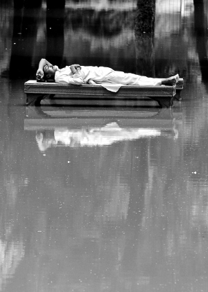 七月十二日,在巴基斯坦拉合尔,一名男子躺在浸在洪水中的长椅上。据当地官员称,拉合尔在过去二十四小时内的降水量达到一百四十毫米。 新华社/法新