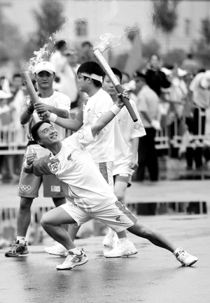 7月12日,北京奥运圣火在大庆传递。图为火炬手陈新(下)在火炬传递中。 新华社发